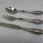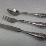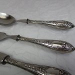 Três talheres, faca, colher e garfo com os cabos em prata com a marca de contraste Águia de 833/1000 milésimas.